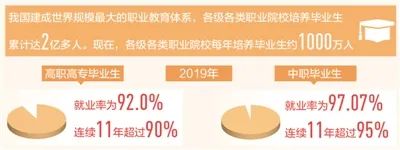 2019年高职高专毕业生就业率为92.0%,连续11年超过90%;中职毕业生就业率为97.07%,连续11年超过95%。