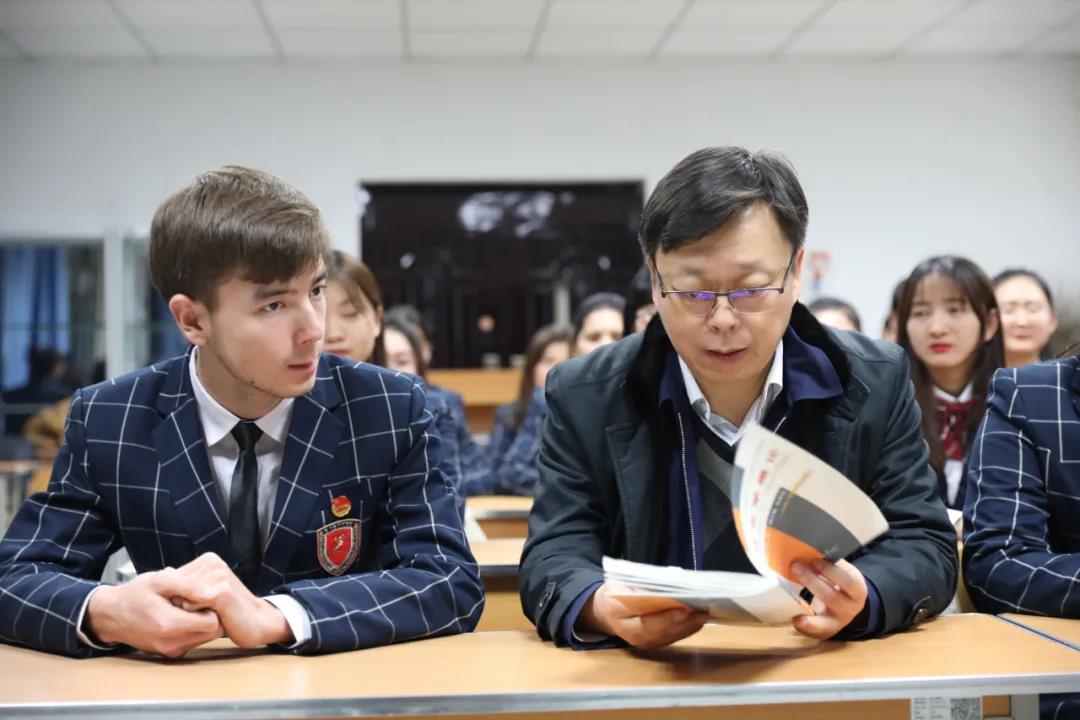 乌鲁木齐职业大学党委书记李长江(前右一)进班级同学生交流。