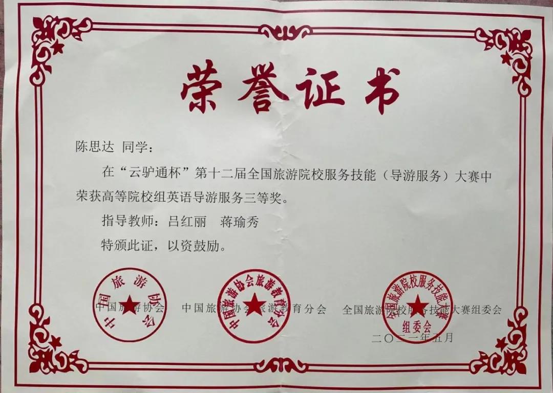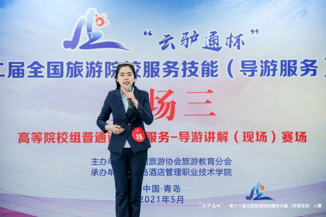 近日,“云驴通杯”第十二届全国旅游院校服务技能(导游服务)大赛在青岛圆满落下帷幕。我校旅游学院旅游管理1803班学生古再丽努尔·卡斯木荣获高等院校组普通话导游服务二等奖、外国语学院英语教育1751班学生吾提库尔·艾孜买提荣获高等院校组英语导游服务二等奖、外国语学院旅游英语1905班陈思达荣获高等院校组英语导游服务三等奖。