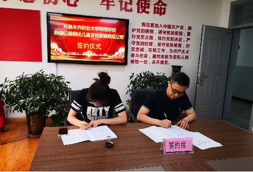 近日,我校师范学院与新疆亿路顺达儿童文化发展有限公司举行了实习实训基地签约和挂牌仪式,学院院长孙晓伟与校企合作企业代表胡锦宇签署合作协议。