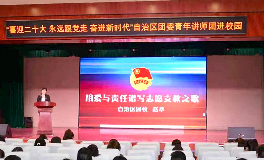 3月30日下午,自治区团委青年讲师团走进我校开展“喜迎二十大、永远跟党走、奋进新征程”主题宣讲活动。自治区团委青年讲师团成员古丽娜·麦麦提明、赵萃、古丽帕丽·乃比江以及我校两位团学骨干作宣讲。我校“青年马克思主义者培养工程”大学生骨干培训班的学员代表聆听了本次宣讲。