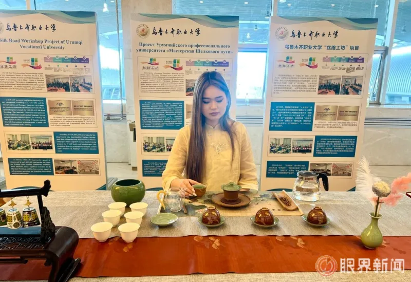 5月13日,2025数智赋能职业教育融合创新专题研讨会现场,乌鲁木齐职业大学留学生展示茶艺。记者王煜摄