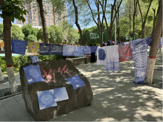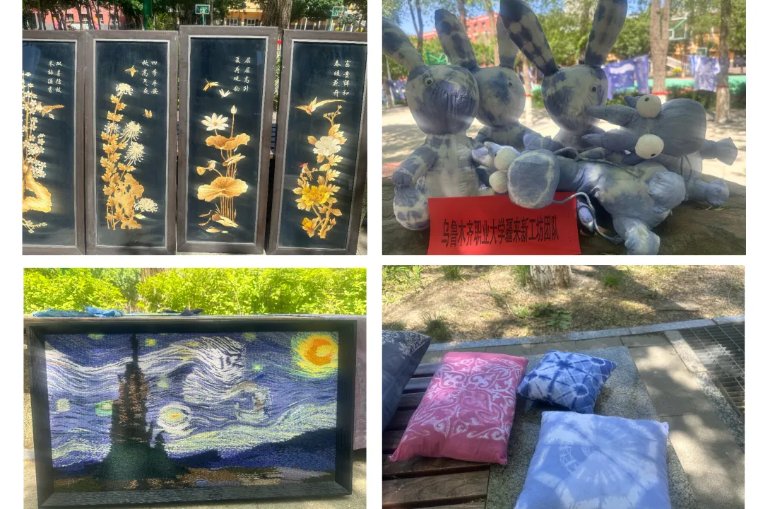 参展作品中有同学们以宿舍为单位创作的装饰品,也有以课程项目为内容的文创品。同学们通过扎染、蜡染的基础技法,选用新疆独特的石榴皮、沙枣叶等植物染料资源,创作出具有浓郁地域特色的作品,吸引各族师生驻足欣赏。