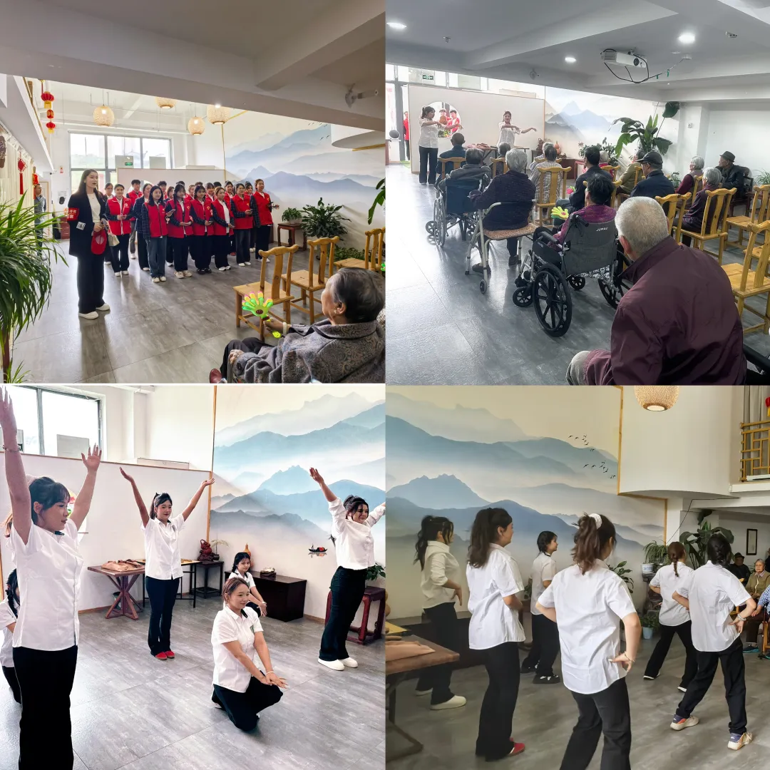 劳动结束后,文艺表演拉开帷幕。为了让表演更贴合老人生活喜好,同学们提前通过调研收集老人们的兴趣爱好,确保演出节目既有时代特色又充满怀旧情怀。声情并茂的经典诗篇诵读传递着对老人的敬意与祝福;婉转悠扬的歌曲演唱《我和我的祖国》《相亲相爱一家人》如潺潺溪流浸润着每个人的心田;旋律昂扬喜庆、灵动婉转的现代舞、民族舞轮番上演,灵动的舞姿赢得了老人们阵阵掌声。