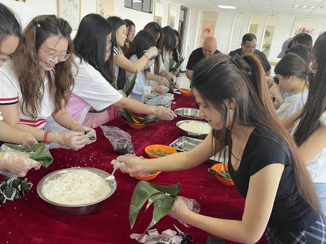 活动现场,在老师的示范下,大家在优美音乐声中一起折粽叶、填糯米、放馅料、扎粽绳,分享各自家乡端午习俗的同时,一颗颗美味的粽子在同学们互帮互助中诞生了。同学们还通过书写与端午相关的诗词,表达对民族团结的美好祝愿。
