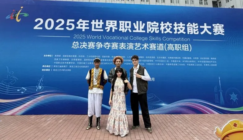 艺术学院教师赵淑萍、孙会宾指导学生帕哈尔丁·麦麦提、陈思羽、穆再排尔·艾斯卡尔、阿迪力·吾吉阿西木编排的作品《大漠弦歌·古道新声》,以丝路文化交融为核心,通过创意音乐短剧串联起一场跨民族、跨代际的“寻音”之旅,同时打破非遗传统单向传播模式,将乐器演奏、声乐演唱与戏剧冲突相结合,最终获得铜奖,诠释了“中华民族一家亲”的深刻内涵。